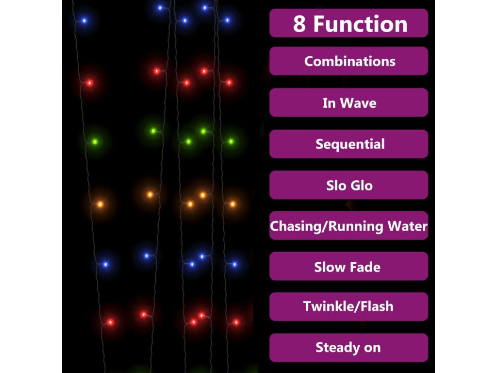 Počas dňa premieňa účinný solárny panel slnečné svetlo na elektrickú energiu uloženú vo vstavanej batérii. V noci sa rozprávkové svetlá automaticky rozsvietia. Svetelná reťaz je vybavená 200 energeticky úspornými LED diódami, ktoré vytvárajú magický svetelný výkon. Má 8 rôznych svetelných efektov: kombinovaný režim, vlny, sekvenčný režim, režim pomalého žiarenia, blikanie, režim pomalého blednutia, trblietanie a nepretržité svietenie. Je to skvelý dekoratívny doplnok na osvetlenie vnútorných a vonkajších priestorov.